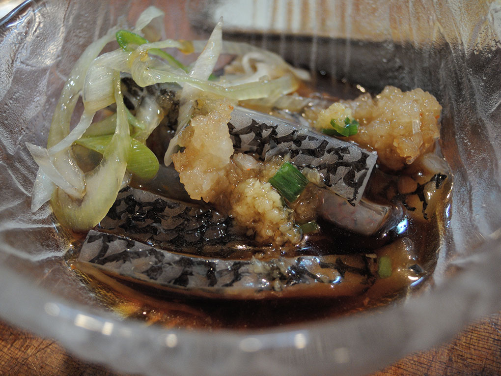 | ミーパイの皮の湯引き。食べ応え十分な厚さ。島ならではの酒肴。 | |